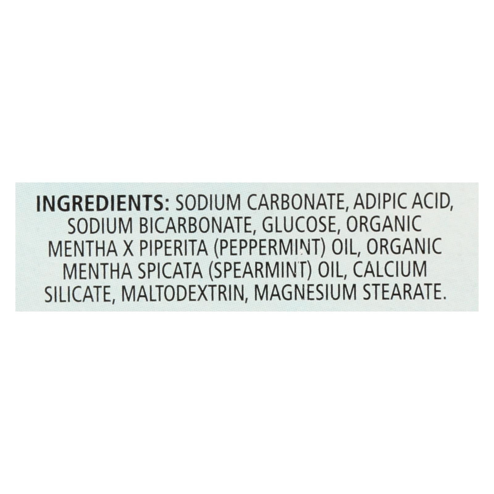 Ingredients : sodium carbonate, adipic acid, sodium bicarbonate, glucose, organic mentha x piperita, peppermint oil, organic mentha spicata, spearmint, calcium silicate, maltodextrin, magnesium stearate