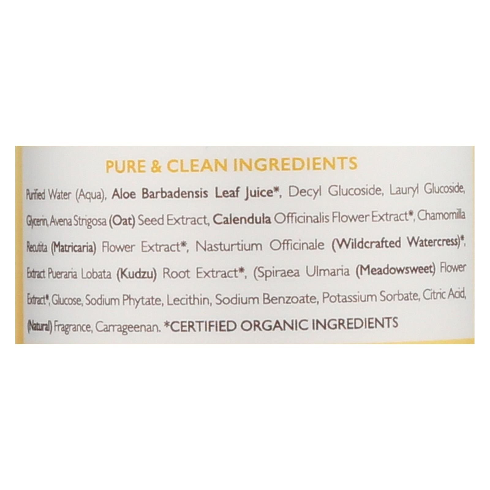 Ingredients: pure & clean purified water, aqua, aloe barbadensis leaf juice, decyl glucoside, lauryl glucoside, glycerin, avena strigosa, oat, seed extract, calendula officinalis flower extract, chamomilla recutita, matricaria, flower extract, nasturtium officinale, wildcrafted watercress, extract pueraria lobata, kudzu, root extract, spiraea ulmaria, meadowsweet, glucose, sodium phytate, lecithin, sodium benzoate, potassium sorbate, citric acid, natural fragrance, carrageenan