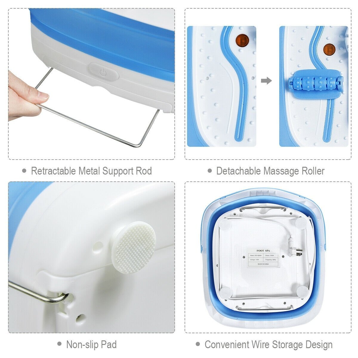 The foldable foot bath massager is ideal for the whole family and will enhance your quality of life. There is only one button for easy operation so you can choose different modes according to your needs. With massage rollers and bubble massage it can effectively promote blood circulation relieve the soreness and fatigue of calves and feet and smooth the meridians. The red light can improve the therapeutic effect as well as reducing swelling pulsation or redness. And you can freely choose the pumice stone scrub brush and roller massager to meet different needs. The foldable and lightweight design saves space for easy carrying and storage. It will provide you with a quiet reading and working environment while massaging your feet. Let your body completely relax with the foot bath massager! If you are looking for it don't hesitate to buy it! Foldable and lightweight design for easy storage and carrying Quick heating gives you a good foot bath experience Bubble massage constantly stimulates the acupuncture points of the feet for a gentle massage Red light function sterilization and promote blood circulation 2 detachable massage rollers promote blood circulation and relieve fatigue Remove dead skin and calluses with a pumice stone a scrub brush and a roller massager One-button operation is convenient for the elderly Retractable metal support rods are very solid and durable Wires can be wrapped around the bottom to save space and avoid clutter 4 non-slip pads help the foot massage tub not easy to shake or slide It has UL certification and is safer to use