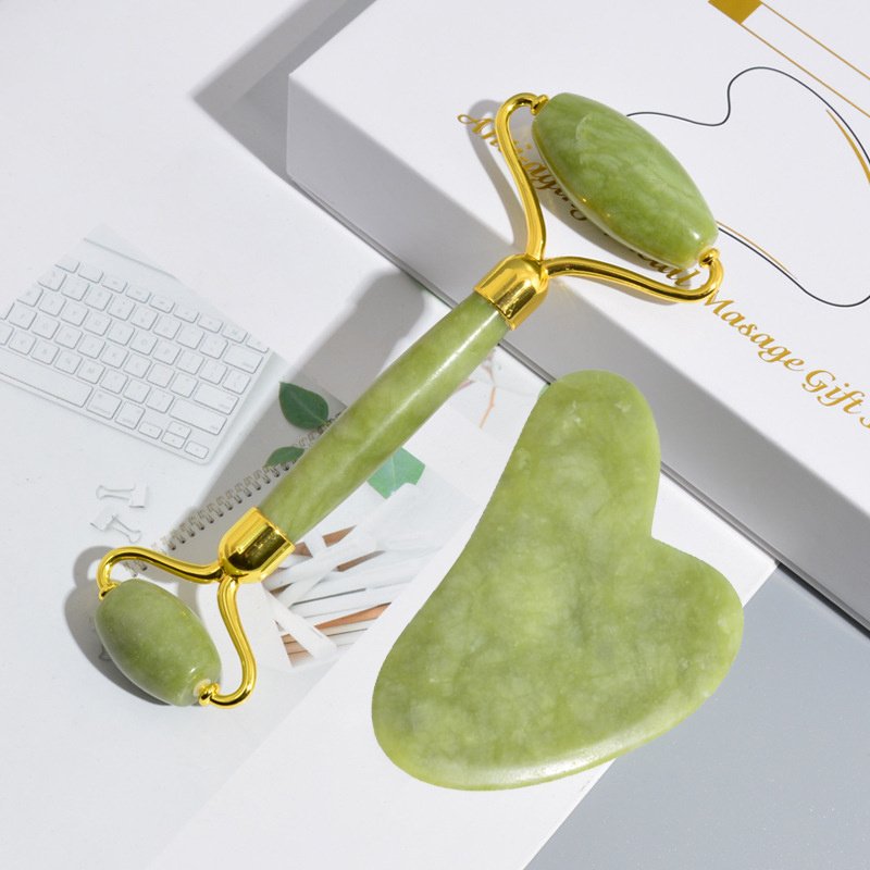 the roller massager and Guasha board is natural jade ; and it is made hand crafted; the color may be some little difference sometimes